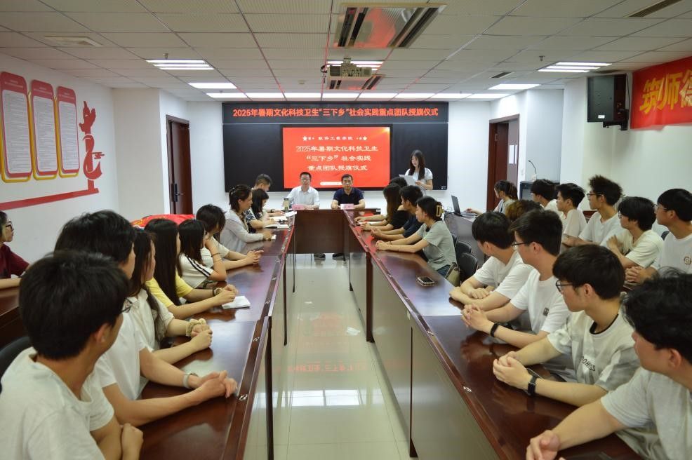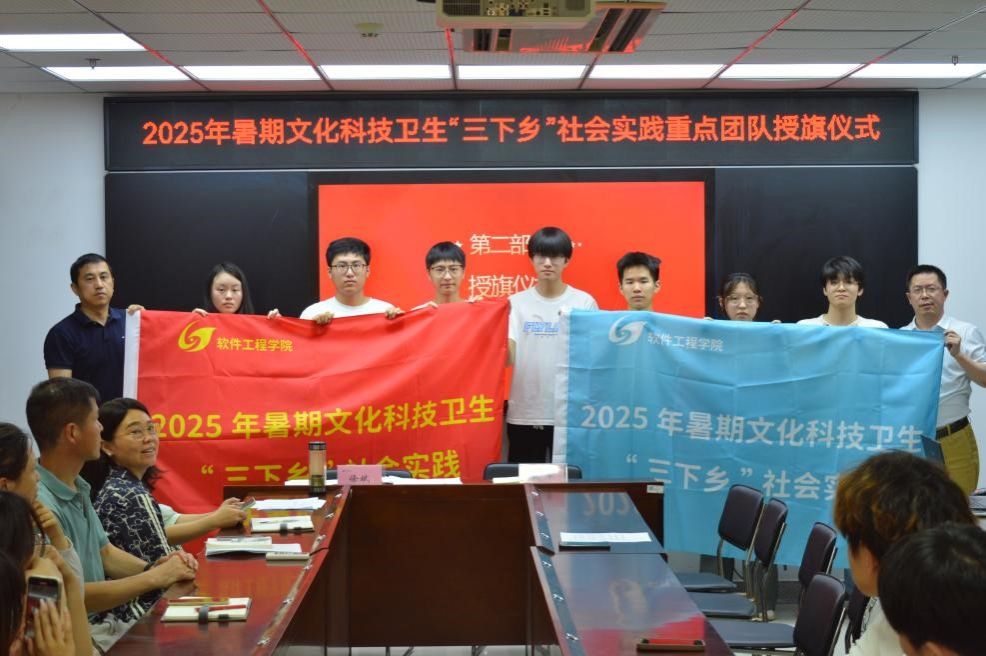 首先,张议允介绍了2025年暑期文化科技卫生“三下乡”社会实践主要从学习宣传习近平新时代中国特色社会主义思想、爱国主义教育、中华文脉传承、科技创新研学、乡村振兴促进、绿色发展倡导、社会服务践行、卫国戍边服务等8方面开展。院团总支书记张理航宣读了《软件学院2025年暑期文化科技卫生“三下乡”社会实践重点团队立项名单》。在庄严的氛围中,戴军书记和徐斌副书记分别为研究生团队和本科生团队授旗。鲜红的旗帜不仅代表着学院的重托,更象征着新时代青年的责任与担当。学生团队代表赵允嘉在发言中表示:“我们将充分发挥专业特长,深入基层一线,在实践中锤炼本领,在服务中彰显价值,用实际行动展现软件工程学子的青春风采。”徐斌副书记在动员讲话中强调:精心组织主题宣讲,传播时代强音;坚持务实作风,确保实践成效;强化安全意识,保障活动顺利开展。