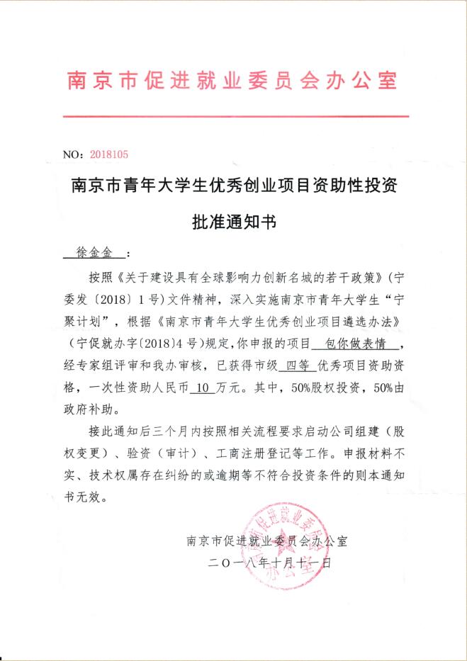 2018年10月11日,在南京市大学生优秀创业项目评比中,必赢437官方网站学子徐金金、韦苗苗“依智科技”团队申报的“包你做表情”项目,被评为南京市大学生优秀创业项目,获得市级四等资助资格,一次性资助10万元。同时,该项目在中国高校计算机大赛(微信小程序应用开发赛)中获得华东赛区三等奖。