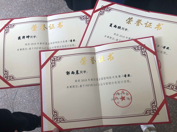 2018年11月23日,第四届全国密码技术竞赛总决赛在杭州电子科技大学成功举办。大赛由中国密码学会主办,国家密码管理局进行指导,中国密码学会教育与科普工作委员会、卫士通信息产业股份有限公司、得安信息技术有限公司、北京鼎九信息工程研究院有限公司、杭州电子科技大学共同承办,天津灵创智恒软件技术有限公司提供技术支持。必赢官网0x36团队以作品“基于PUF的IoT认证与密钥分发设计实现”获决赛二等奖。