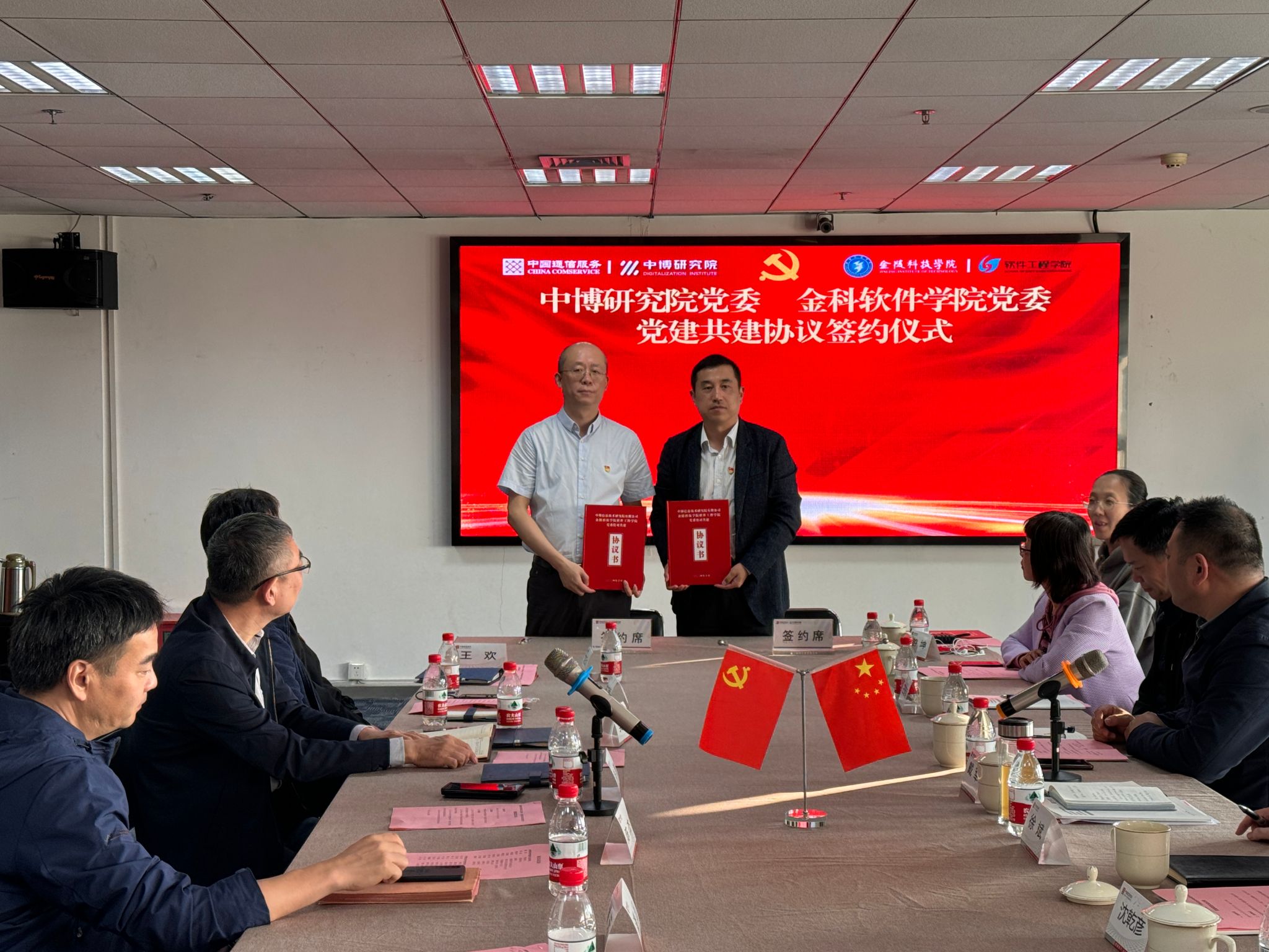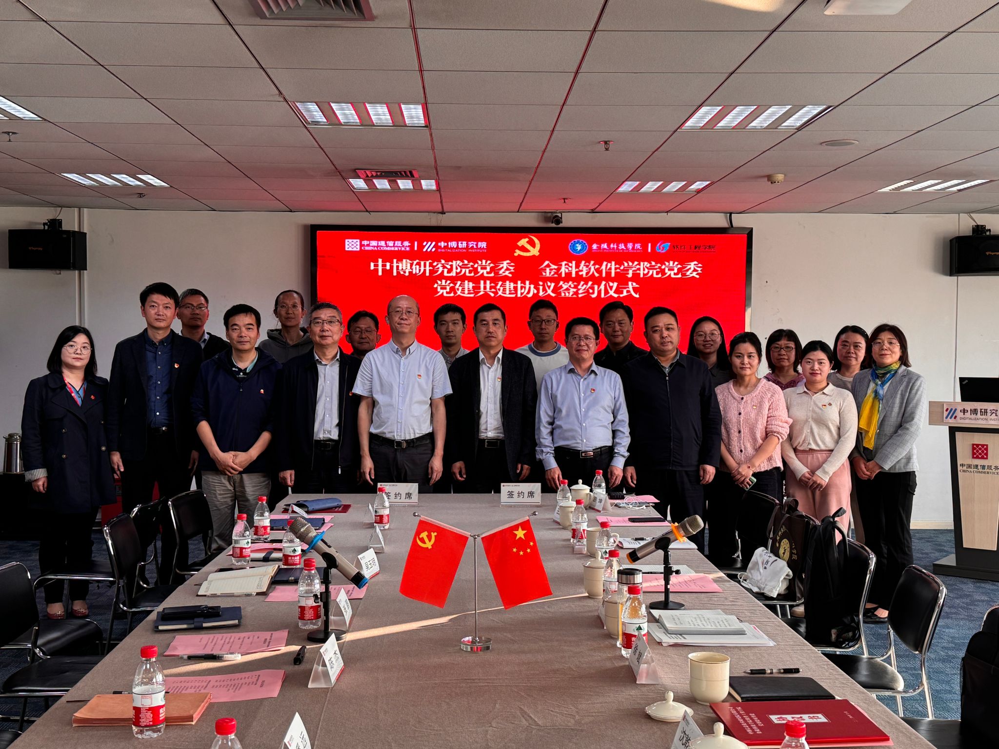 会上,双方首先就党的二十届三中全会精神、习近平总书记关于发展新质生产力的重要论述进行了学习;张鹏简要介绍了中博研究院党组织及党建概况、单位发展历程、科研成果和未来业务规划;戴军从坚持从严治党、全面加强党的建设、专业人才培养、学院社会服务能力和品牌影响力等层面系统介绍了软件学院近年来的党建工作及发展概况。签约仪式环节,双方就党建共建内容及形式进行了深入交流,初步在党组织活动共建、政治理论联学等方面达成共识,期待能充分发挥各自平台和资源优势,推动双方在党组织和党风廉政建设、应用型软件人才培养、产教融合、软件开发与应用转化等方面实现创新与合作发展。