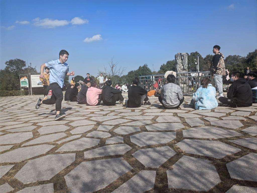 在观景台附近,所有队员分为六组,分别进行了丢沙包、击鼓窗花和丢手绢等素质拓展游戏项目,随着游戏的进行,大家玩得兴致勃勃,登山的疲倦一扫而空,欢声笑语回荡在山风中,学习压力得到了释放。