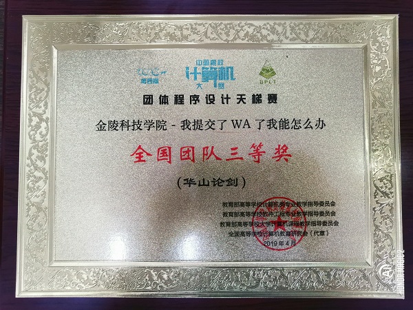 2019年3月30日,必赢437官方网站、网络安全学院郭晓芃、苏汀等30名学生组成的3支学生团队参加了第四届中国高校计算机大赛—团体程序设计天梯赛华山论剑组的比赛,必赢官网荣获“江苏省高校特等奖”和团队二等奖1项、团队三等奖2项,其中《我提交了WA了我怎么办》团队最终获得第四届中国高校计算机大赛—团体程序设计天梯赛全国团队三等奖。
