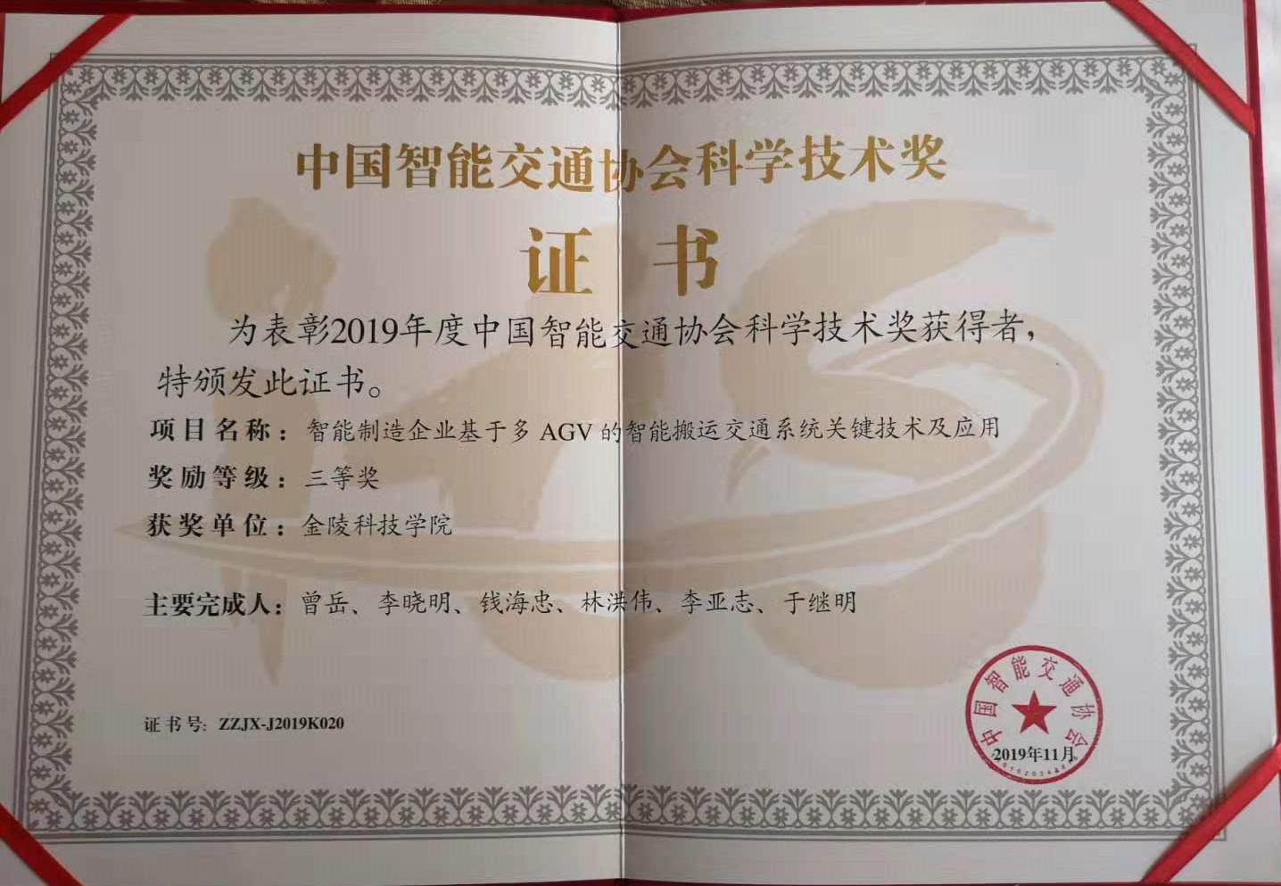 2019年度中国智能交通协会科学技术奖颁奖仪式在青岛银沙滩温德姆至尊酒店举办。必赢官网软件学院曾岳教授作为第一完成人,及其团队共同完成的“智能制造企业基于多AGV的智能搬运交通系统关键技术及应用”获评三等奖。