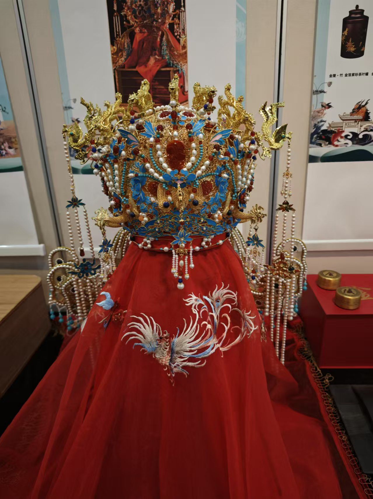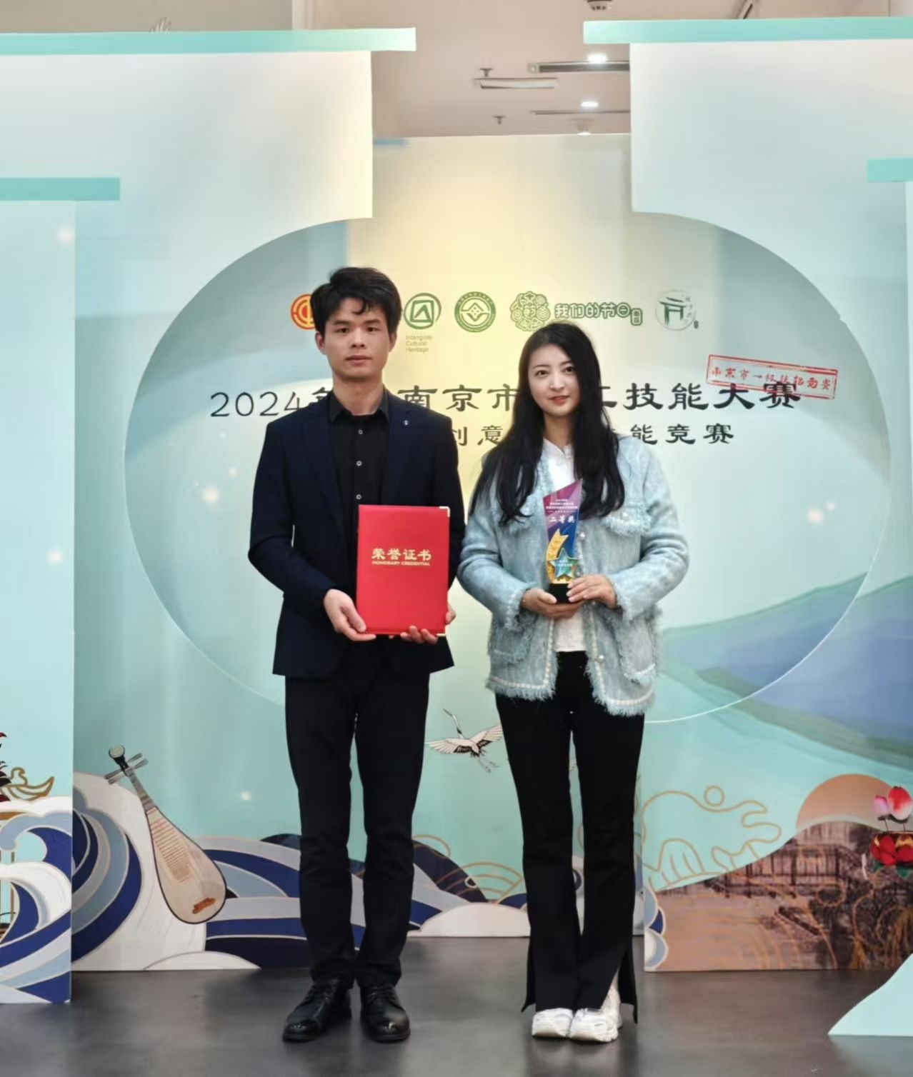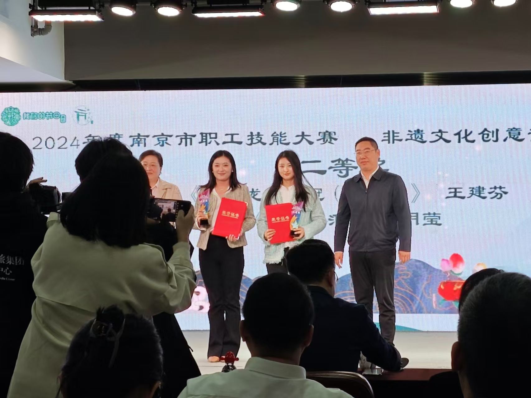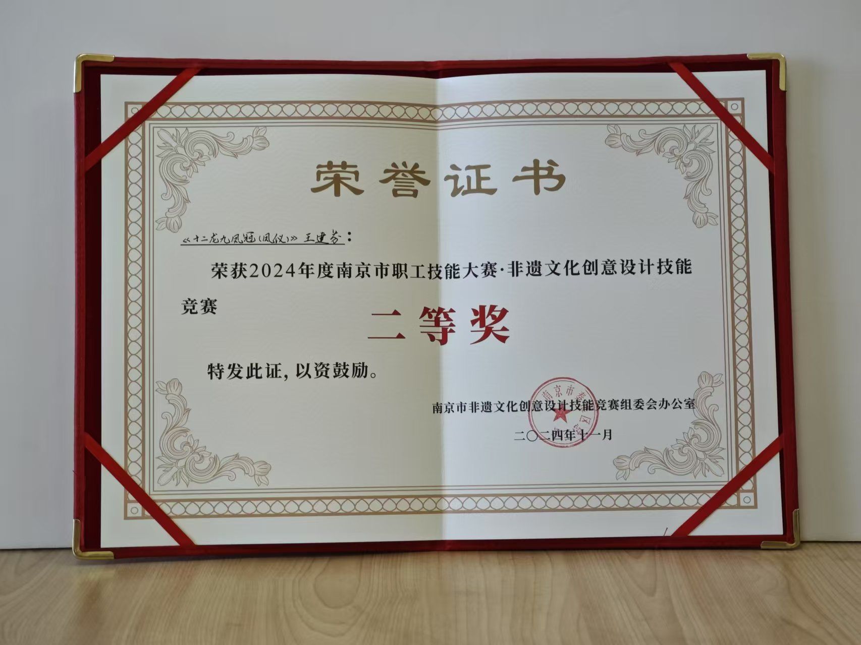 2024年度南京市职工技能大赛非遗文化创意设计技能竞赛,决赛于2024年11月8号举行,来自必赢437官方网站的 “三生令原创国风发冠”项目,通过初赛、复赛的激烈角逐,进入到决赛,品牌创始人马永强、王建芬携带原创产品非遗点翠复原款“十二龙九凤冠(凤仪)”参加决赛,荣获二等奖。