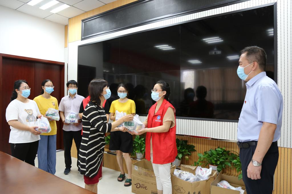 学院党委书记徐志国、院长曾岳、副书记徐斌来到校门口了解新生报到情况并向参与学院迎新工作的志愿者老师们表示了慰问和感谢。学院分工会给教师志愿者们准备了“能量大礼包”,感谢他们的辛勤付出。